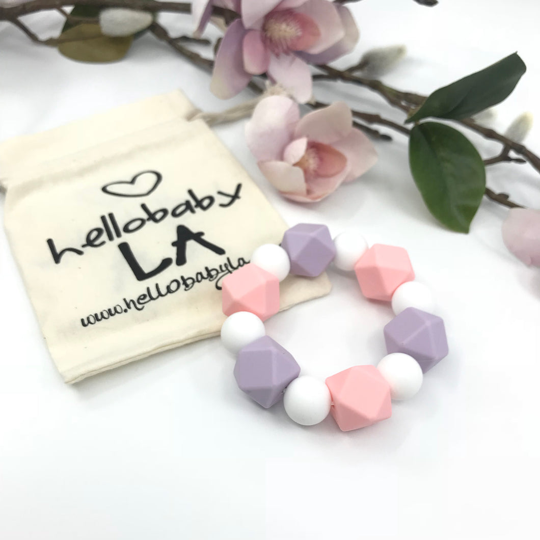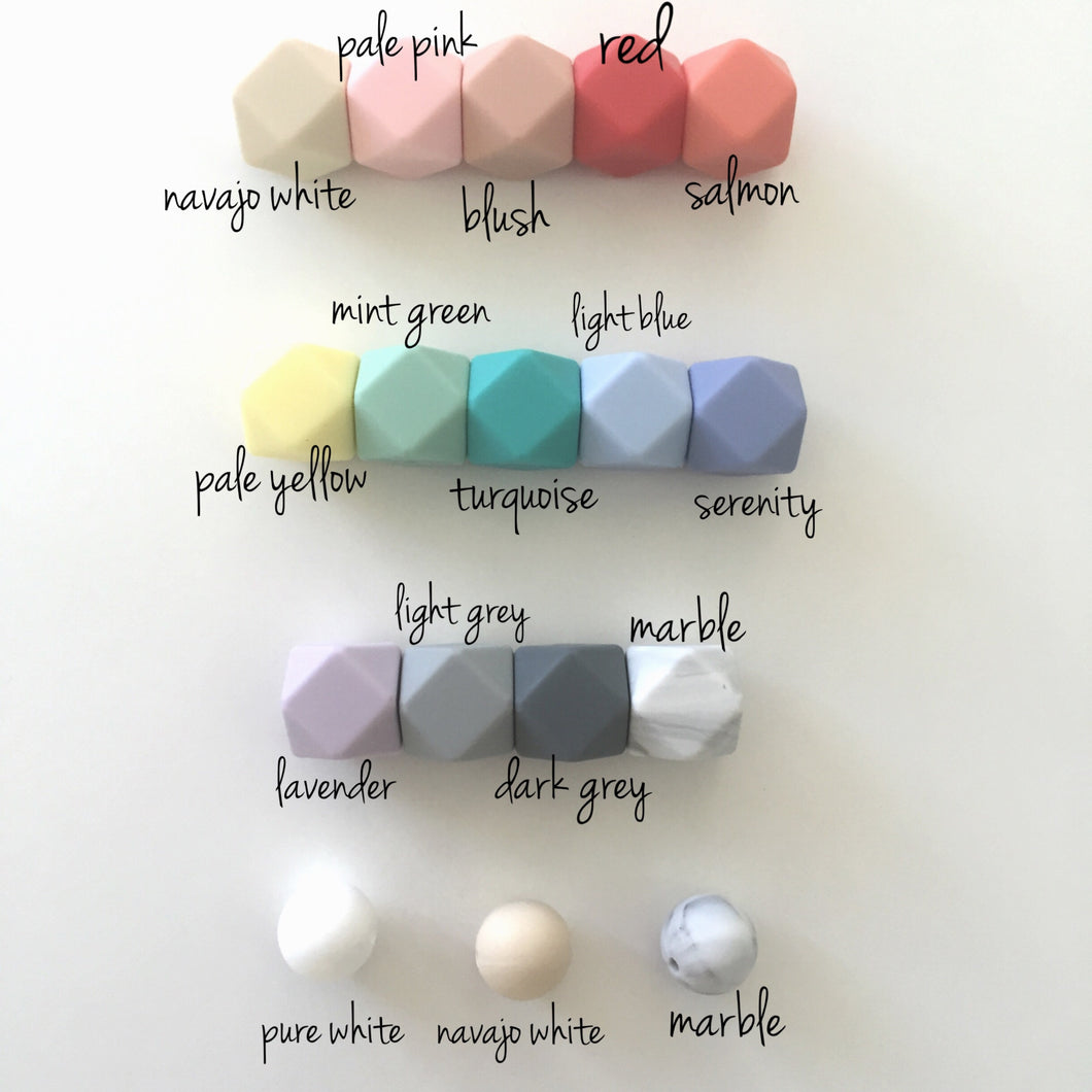 This freezable teether is perfect for those that like to custom colors to fit their own style... The whole teether is freezable and perfect for your little one! Similar to our popular custom teether rattle, you pick you hexagon beads and round beads to create your custom teether. These are all silicone and do not have the wood pieces so they last much longer :)