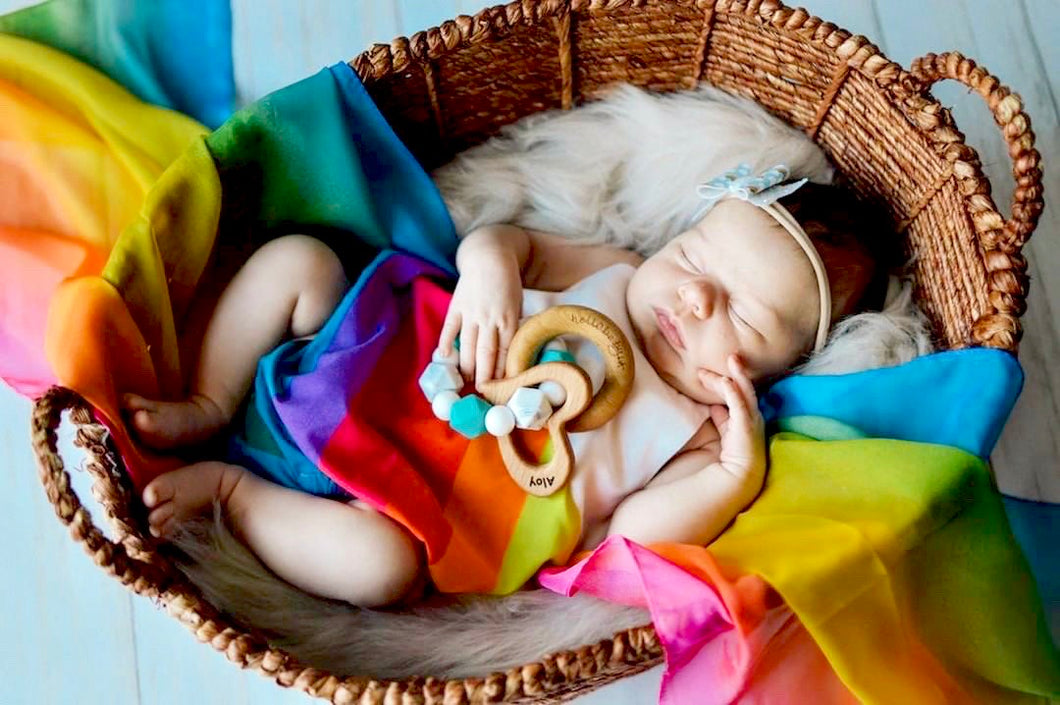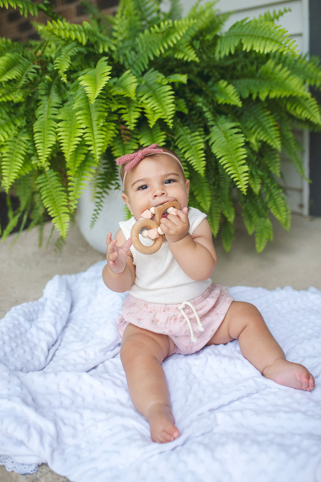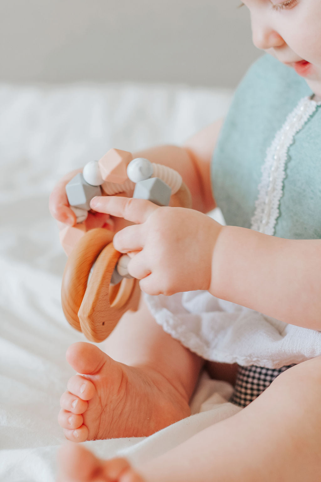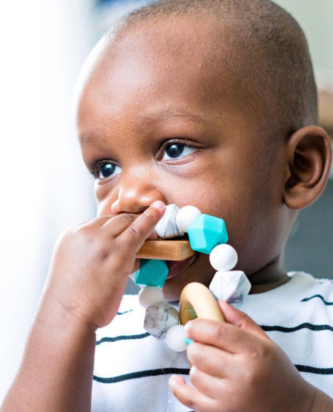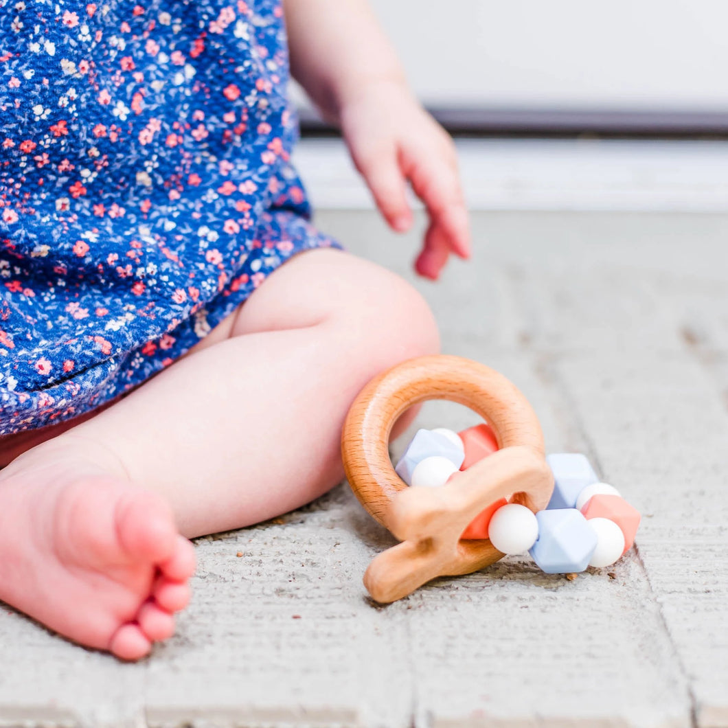 - Silicone teething ring with wood animal for a different texture for your teething baby